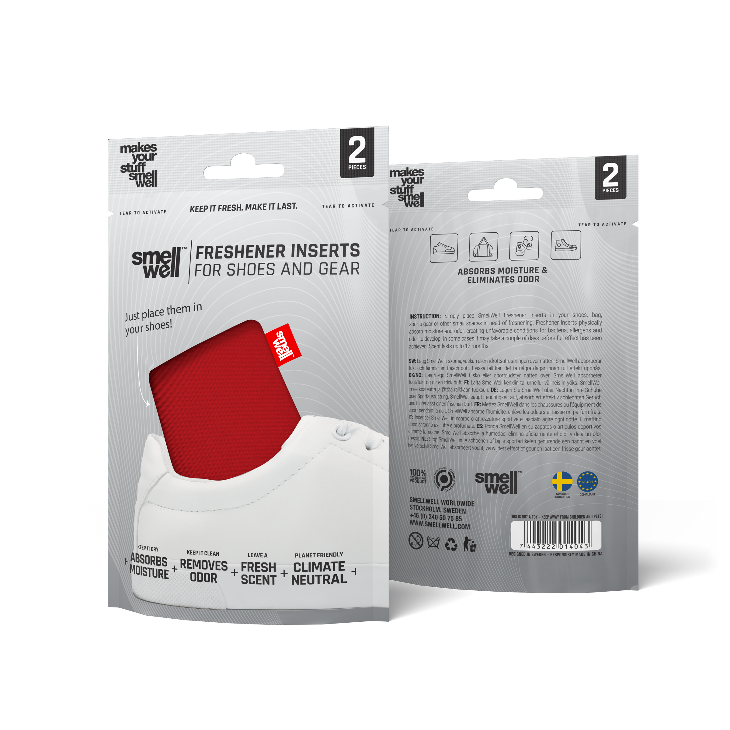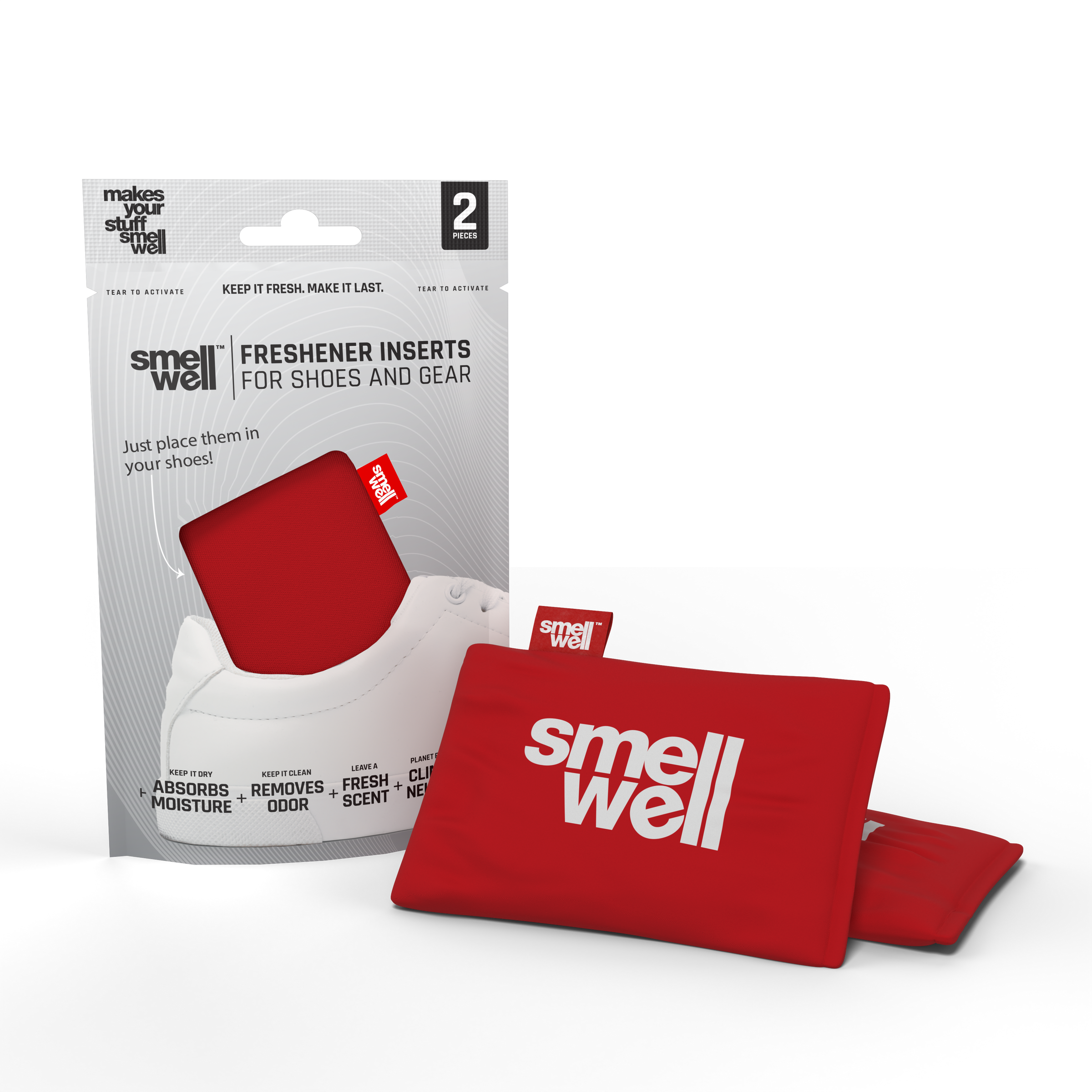 SmellWell Freshener Inserts is a natural 3-in-1 solution that effectively absorbs moisture, removes odors, and leaves a long-lasting fresh scent. Just throw them in your shoes, gear or bag and experience a real difference!